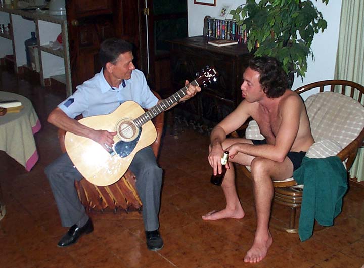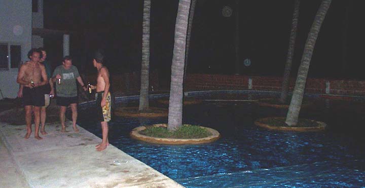 Men coming back from wandering on the beach. Love the palms in the pool.